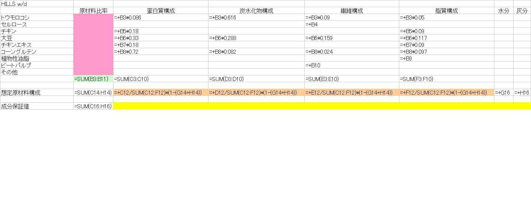 となり、最大構成比であるはずのラム肉粉が少ないので補正をかける